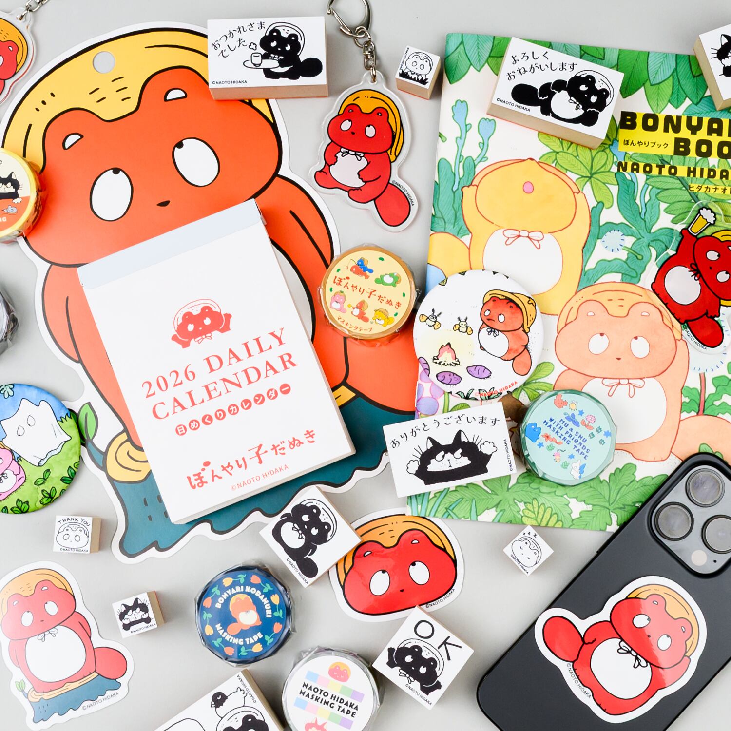 2025年9月19日(金)~28日(日)までトーキョーピクセルギャラリーで開催中のヒダカナオト個展「ぼんやり子だぬきの秋祭り」で展示販売している作品、グッズです。