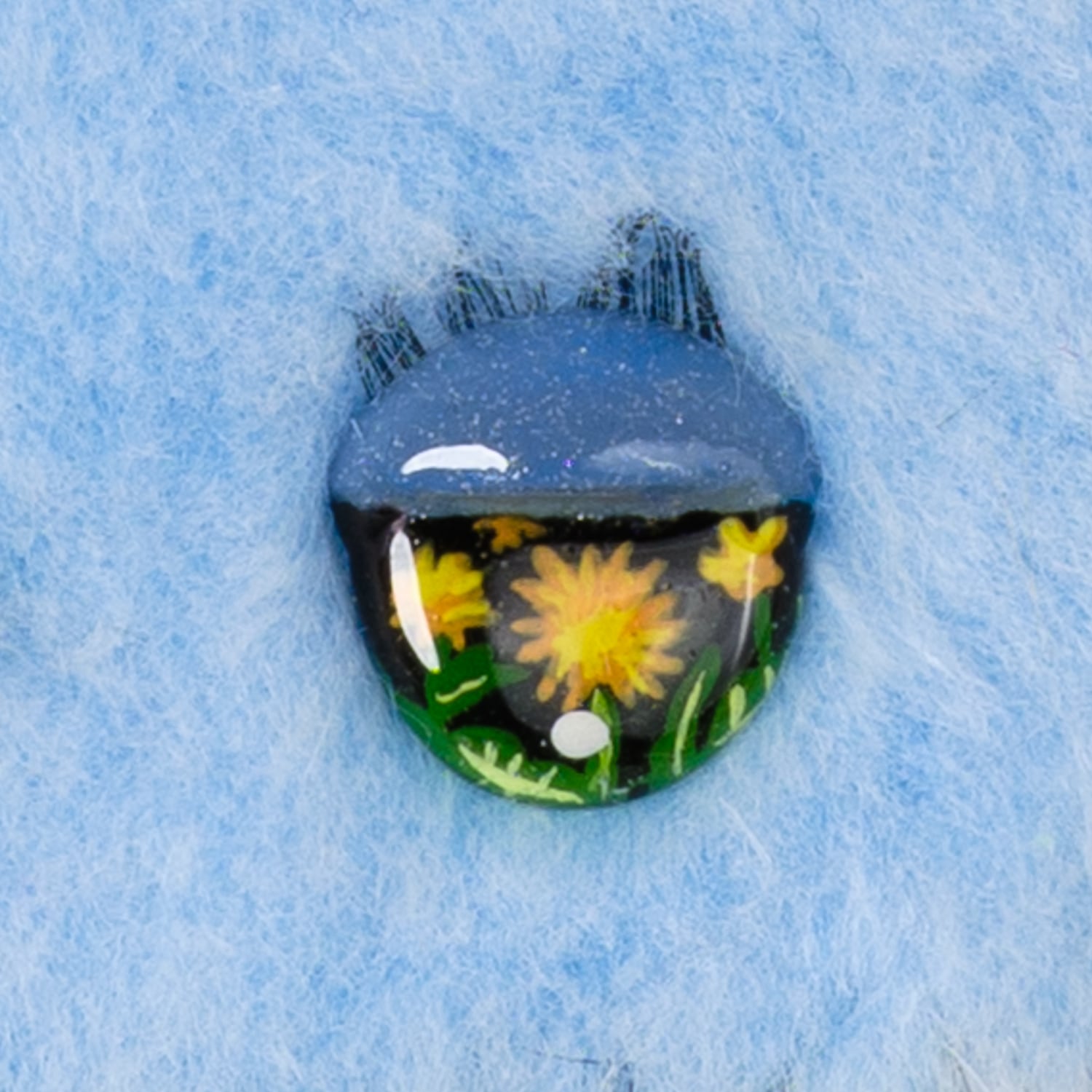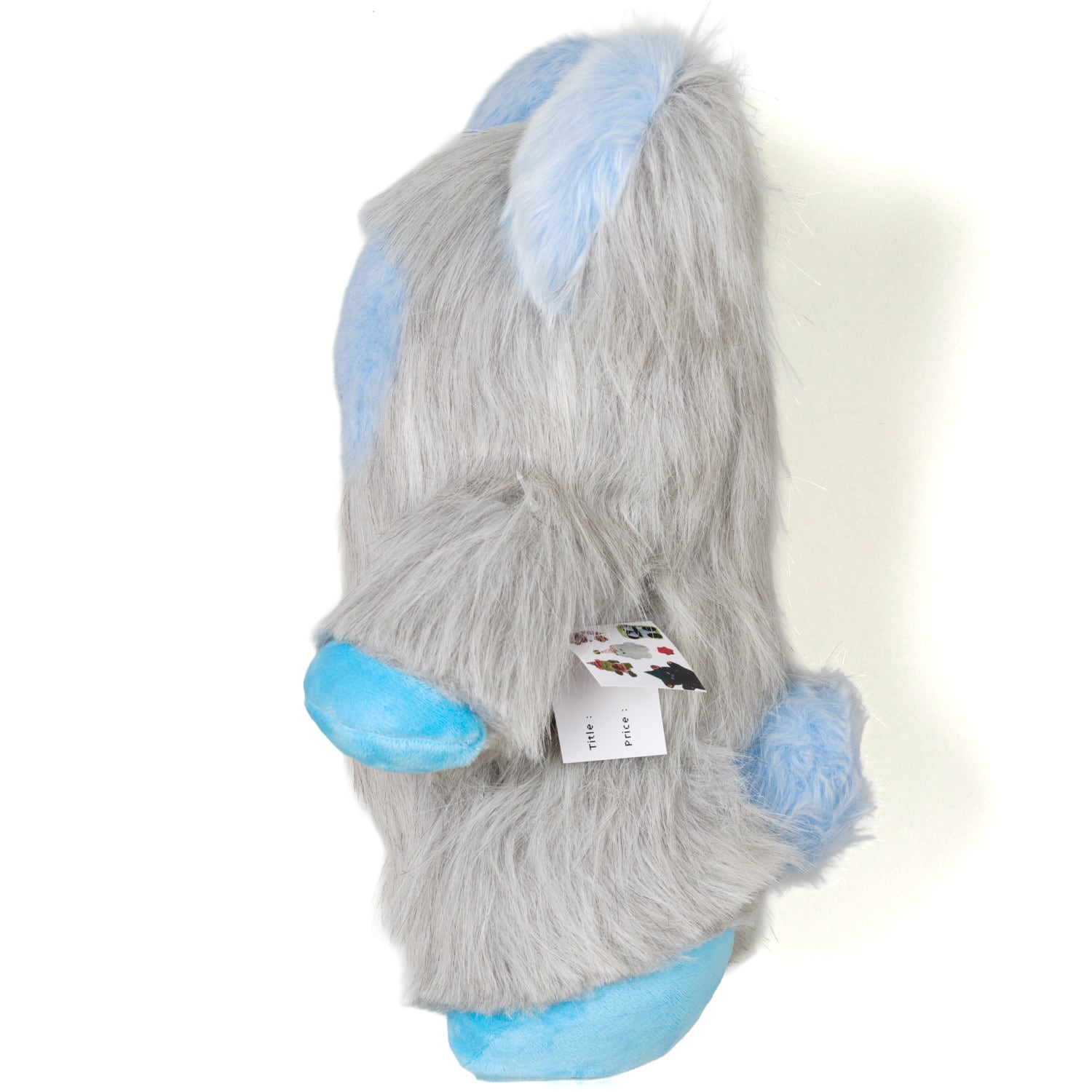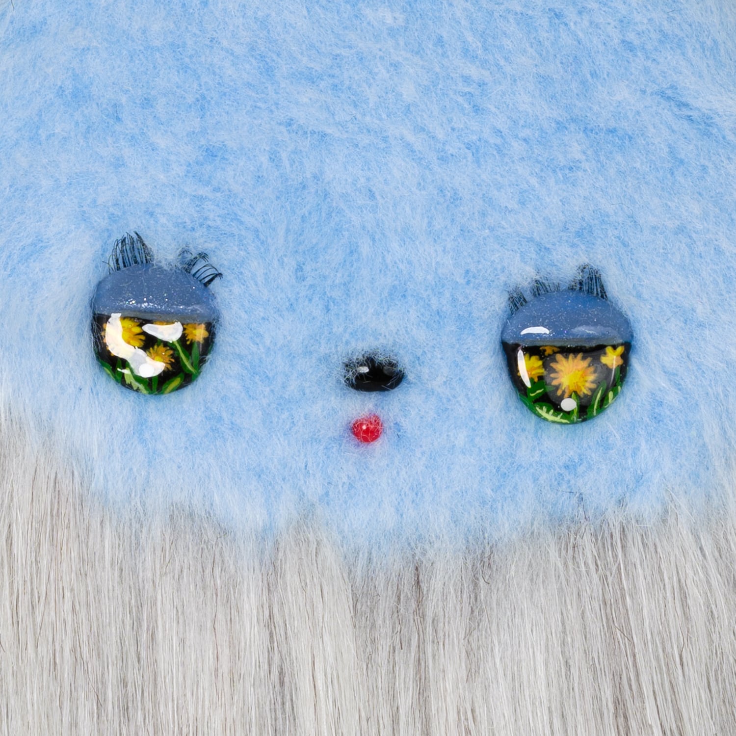 Polyester faux fur, polyester stuffing, plastic eyes, acrylic paint, resin