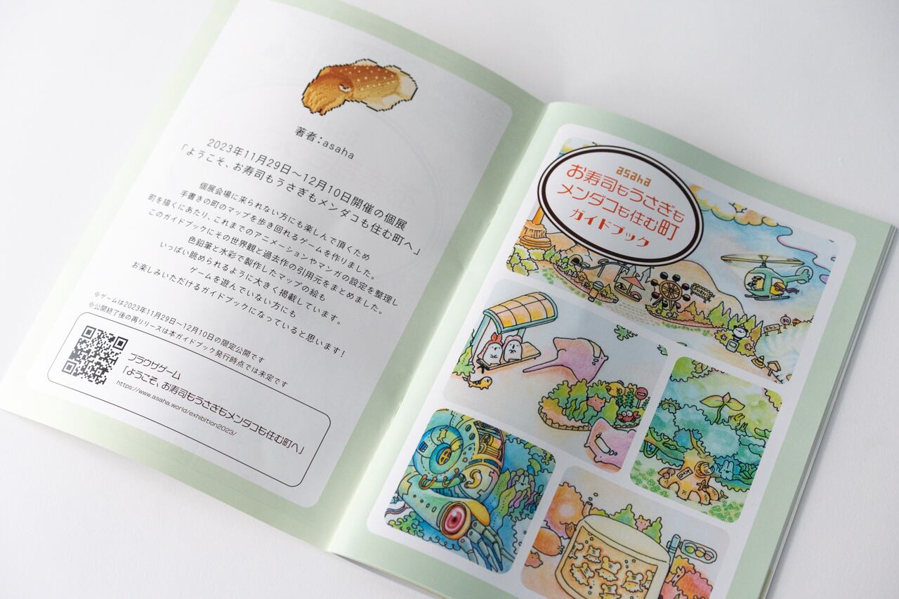 2023年11月29日(水)〜12月10日(日)までトーキョーピクセルギャラリーAで開催中のasaha個展 「ようこそ、お寿司もうさぎもメンダコも住む町へ」で展示販売している作品、グッズです。