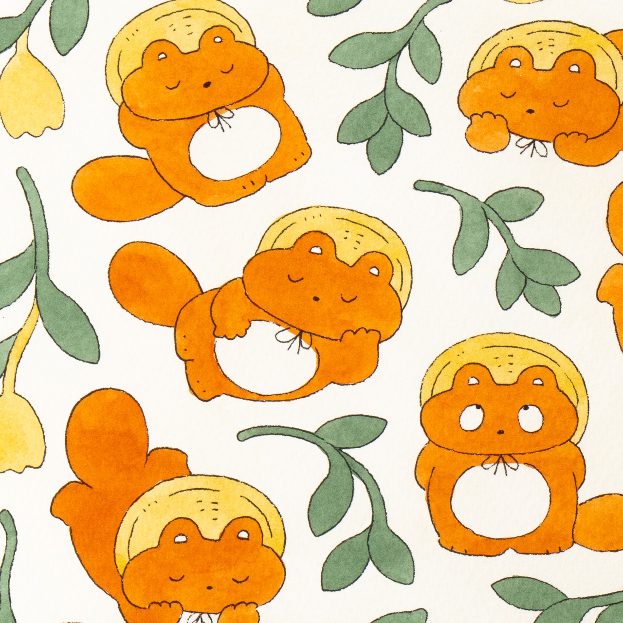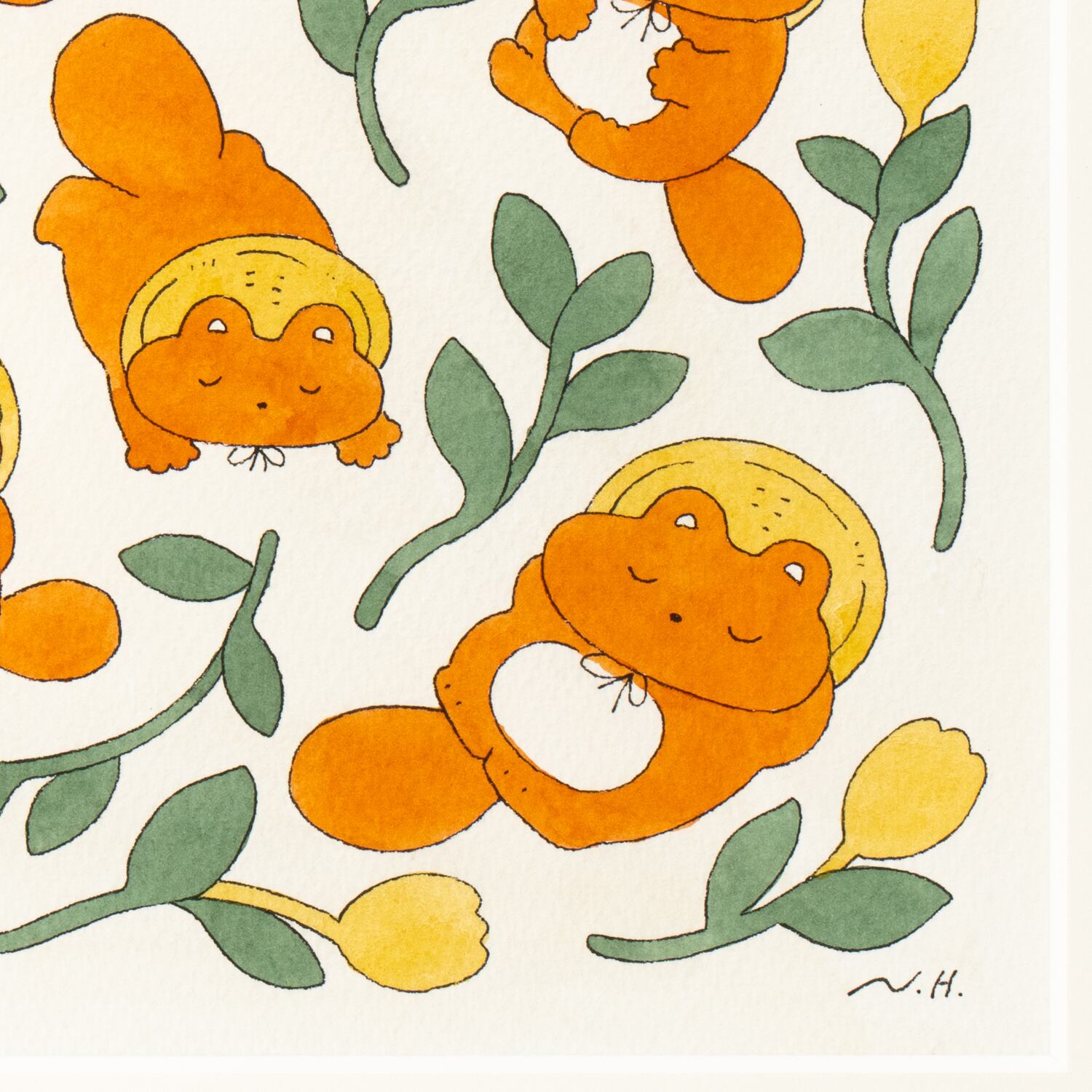 【会場売約済】ヒダカナオト 原画17「ぼんやり子だぬきたちの昼寝」 額装込み、直筆サイン入り