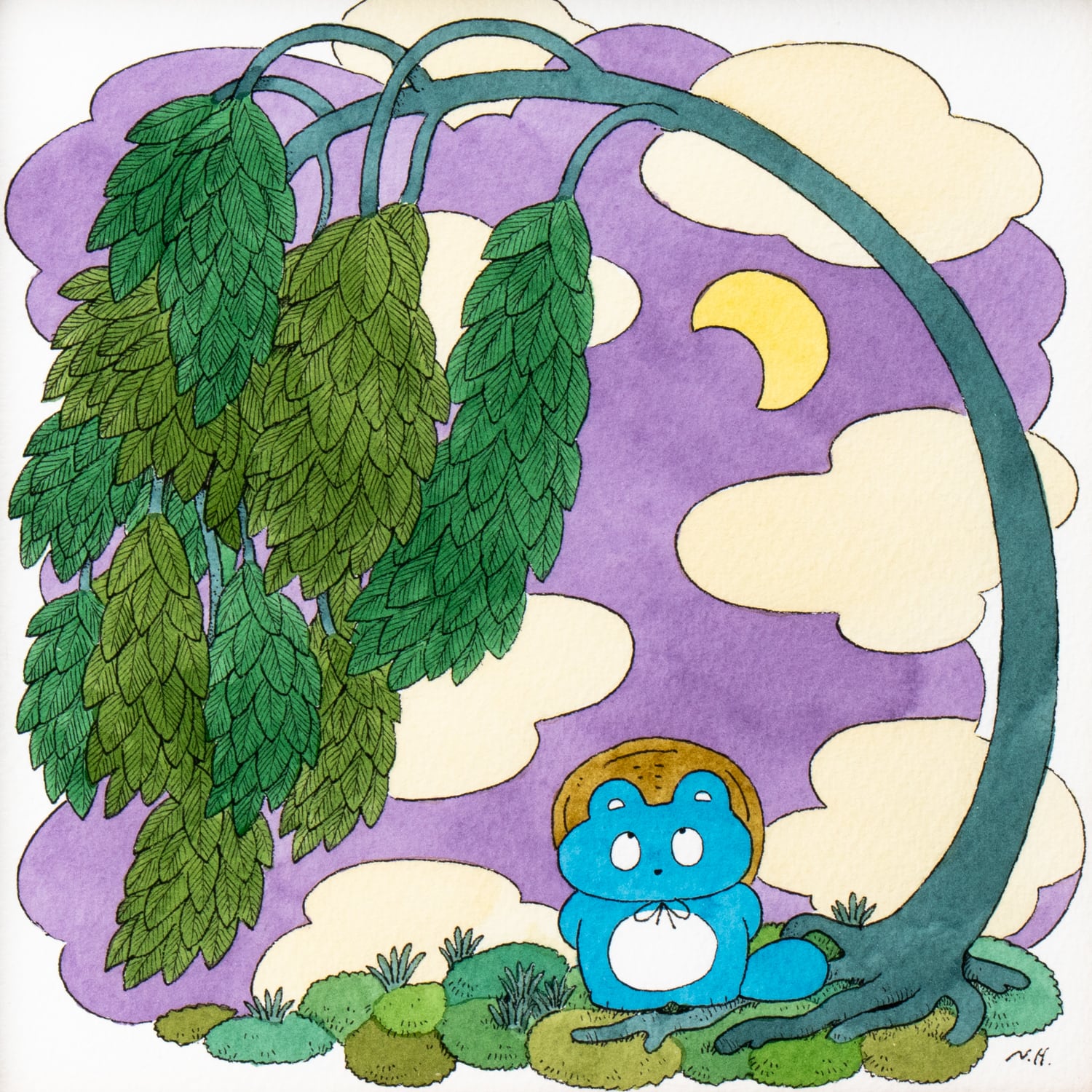 ヒダカナオト 原画13「ぼんやり子だぬきと三日月」 額装込み、直筆サイン入り