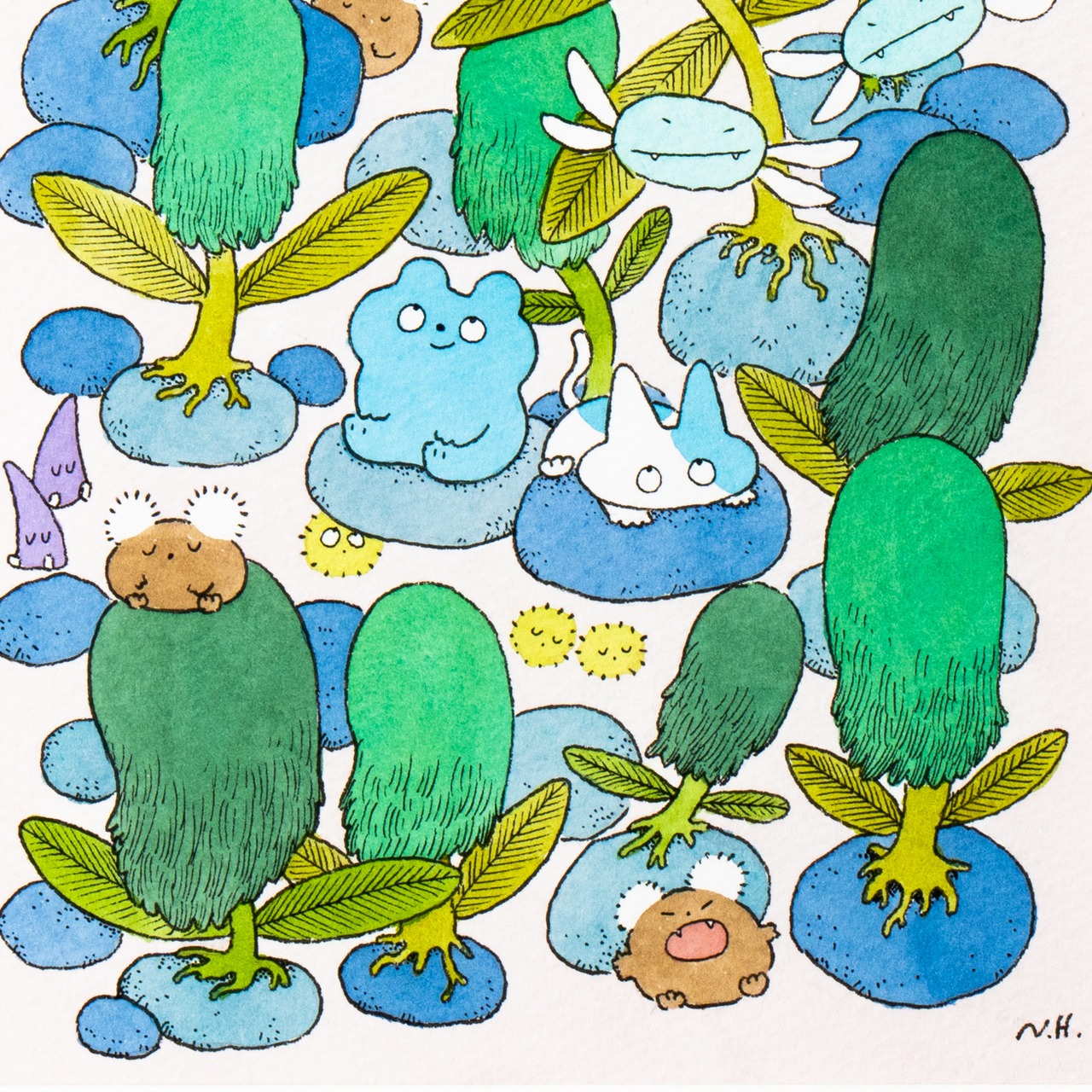 毎年個展を開催しながら、雑誌や広告等のイラストレーションを制作している。ペンと水彩絵の具で空想の生き物や植物を描いている。
