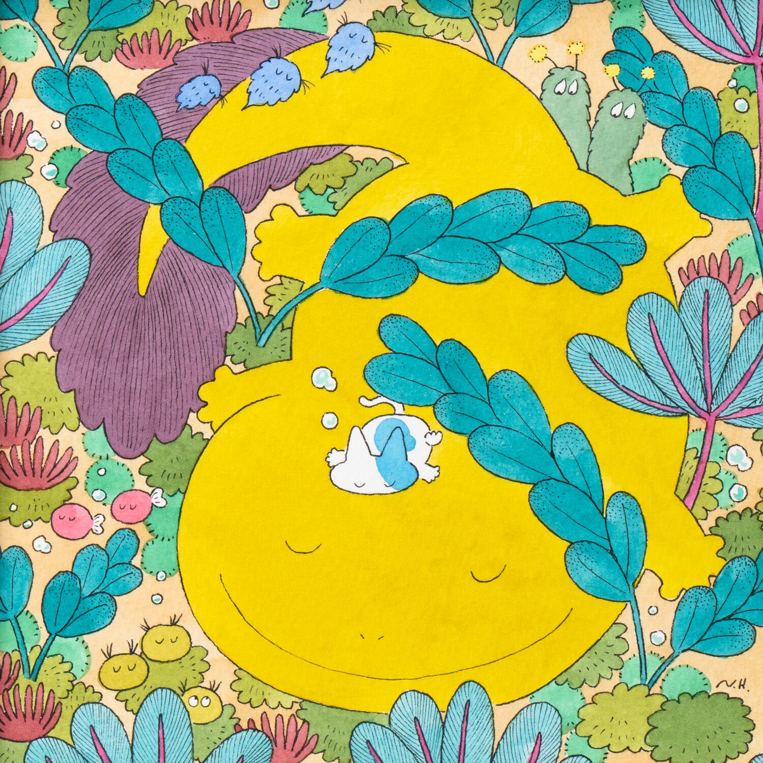 「優しいメロデイーが聞こえてくるような森の中で、生き物たちがうたた寝をしている」というイメージで描きました。